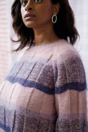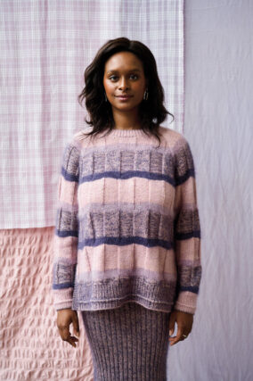 Calluna is a loose-fitting sweater that is worked from top to bottom with a wide ribbed pattern. The sweater is knitted in rounds and then divided to knit the hems back and forth. The cuffs and hems have a small hem and the side slits are edged with ribs. The sleeves are long and are knitted in rounds. The mottled stripes are created from different combinations of smooth fingering yarn and two threads of a mohair silk blend and are repeated on the body and sleeves.