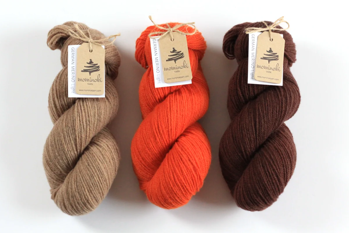 Content of the set – Selected amount of the yarn (German Merino Light), sew in label, Mominoki Yarn cotton bag