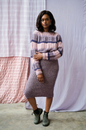 Giverny is knitted from top to bottom in a 2×2 rib pattern, starting with a provisional stop at the waist. An elastic band is sewn into the knitted waistband before it is closed by removing the provisional cast-on and knitting the live stitches together with the provisional stitches. Cropped rows lift the back of the skirt; Elevations gradually widen the skirt at the hips before slightly diminishing it for a tighter fit. The main body of the skirt is knitted straight before being slit in the middle of the back for comfort and freedom of movement. The hem is finished with an Italian/tubular dart. Sewing a small label or thread on the inside of the skirt will make it easier to see the back when you wear it.