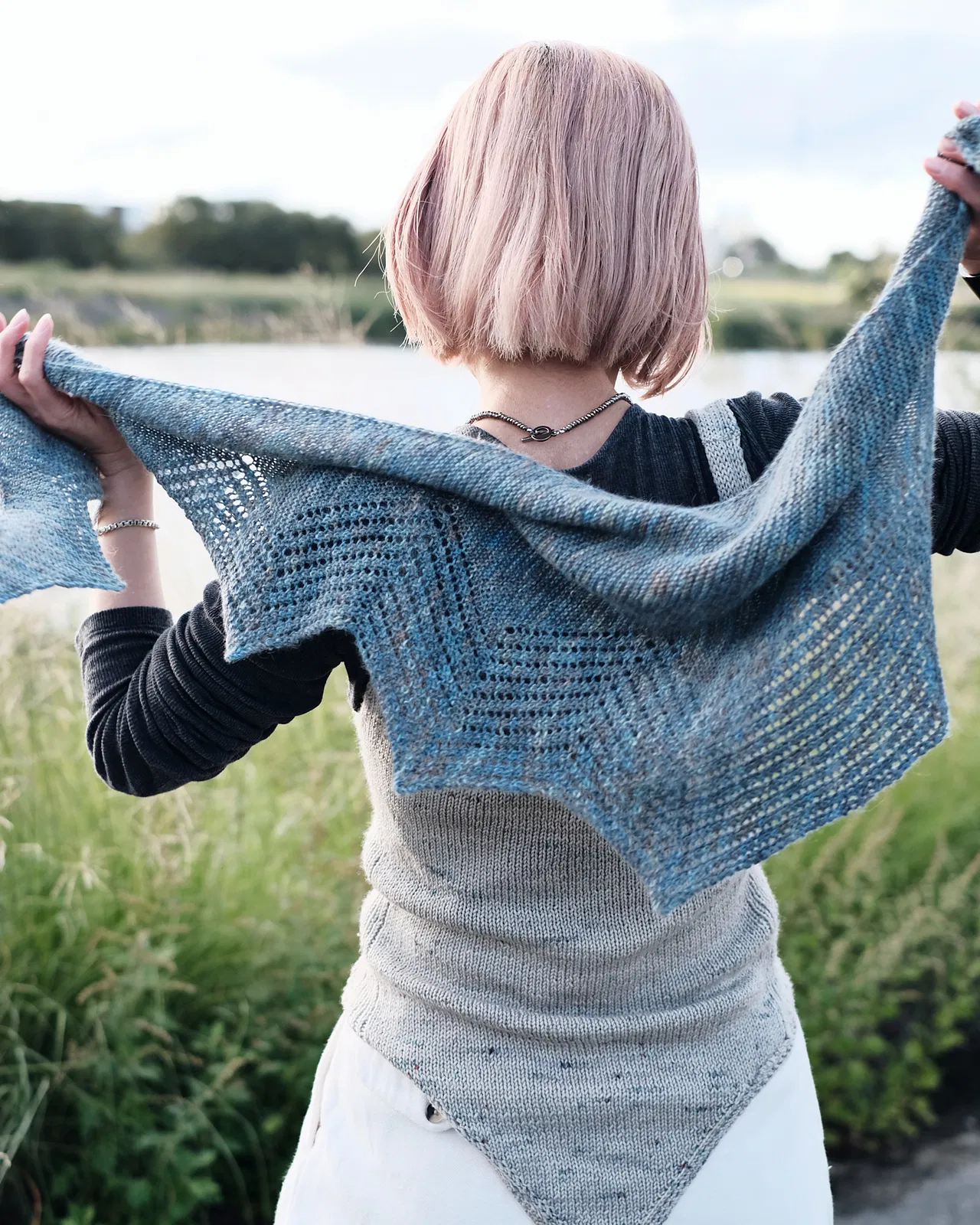 Pflegeanleitung: Handwäsche mit lauwarmem Wasser. Strickstück liegend trocknen.