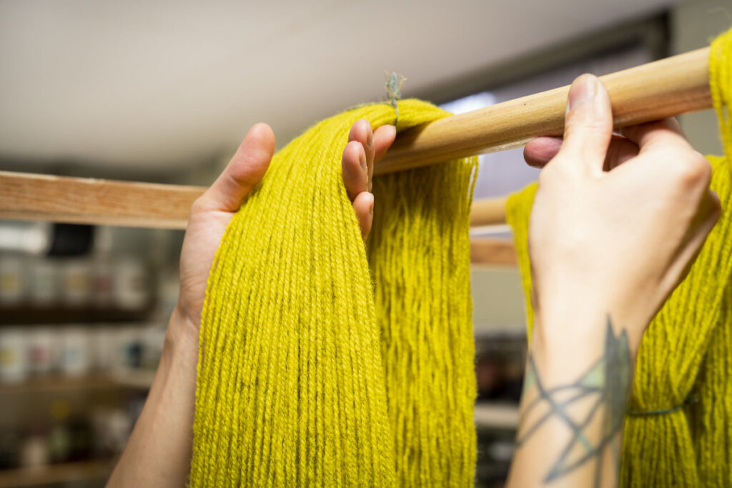 Die gefärbten Garne werden getrocknet und zu Strängen aufgewickelt. Ein Etikett vollendet schließlich das Mominoki Yarn-Produkt.