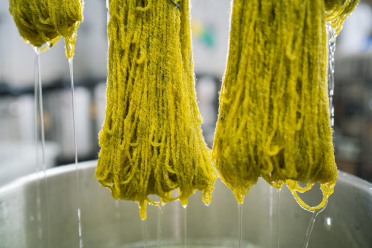 Die Vorbereitung für das Färben beginnt damit, dass die im Atelier angekommenen Rohwollbündel sorgfältig für den Färbeprozess vorbereitet werden. Wolle mit viel Fett und Schmutz wird gründlich gewaschen.